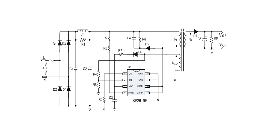 SP2619P 是一款性能優異的原邊反饋控制電路,應用于小功率 AC/DC 充電器與適配器。控制電路使用原邊采樣技術進行精確的恒流、恒壓控制,可以省去一般應用中的光耦與 TL431。