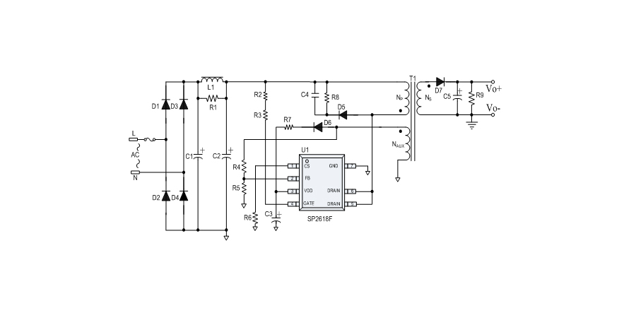 SP2618F是一款性能優異的原邊反饋控制電路,應用于小功率AC/DC充電器與適配器。控制電路使用原邊采樣技術進行精確的恒流、恒壓控制,可以省去一般應用中的光耦與TL431。