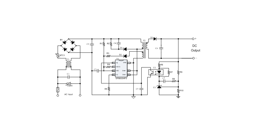 SP6600HPS在PWM模式下工作于固定頻率,這個頻率是由內部精確設定的。在空載或者輕載時,工作頻率由IC內部調整。芯片可以工作在綠色模式,以此來減小輕載時的損耗,提高整機的工作效率,SP6600HPS在啟動和工作時只需要很小的電流,可以在啟動電路中使用一個很大的電阻,以此來進一步減小待機時的功耗。芯片內置有斜坡補償電路,當電路工作于大占空比時,避免次諧波振蕩的發生,改善系統的穩定性。內置有前沿消隱時(Leading-edge blanking time),消除緩沖網絡中的二極管反向恢復電流對電路的影響。SP6600HPS采用了抖頻技術,能夠有效改善系統的EMI性能。系統的跳頻頻率設置在音頻(20KHz)以上,在工作時可以避免系統產生噪音。SP6600HPS內置多種保護,包括逐周期限流保護(OCP),過載保護(OLP),過壓保護(OVP),VDD過壓箝位,欠壓保護(UVLO),過溫保護(OTP)等,通過內部的圖騰柱驅動結構可以更好的改善系統的EMI特性和開關的軟啟動控制。