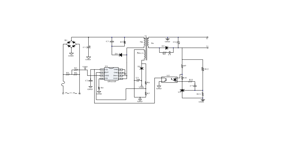 SP6616P是一顆電流模式PWM控制芯片,內(nèi)置650V高壓功率MOSFET,應用于功率在13W以內(nèi)的方案。SP6616P在PWM模式下工作于固定開關頻率,這個頻率是由內(nèi)部精確設定。在空載或者輕載時,工作頻率由IC內(nèi)部調(diào)整。芯片可以工作在綠色模式,以此來減小輕載時的損耗,提高整機的工作效率。SP6616P在啟動和工作時只需要很小的電流,可以在啟動電路中使用一個很大的電阻,以此來進一步減小待機時的功耗。芯片內(nèi)置有斜坡補償電路,當電路工作于大占空比時,避免次諧波振蕩的發(fā)生,改善系統(tǒng)的穩(wěn)定性。內(nèi)置有前沿消隱時(Leading-edge blanking time),消除緩沖網(wǎng)絡中的二極管反向恢復電流對電路的影響。SP6616P采用了抖頻技術,能夠有效改善系統(tǒng)的EMI性能。系統(tǒng)的跳頻頻率設置在音頻(20KHz)以上,在工作時可以避免系統(tǒng)產(chǎn)生噪音。SP6616P內(nèi)置多種保護,包括輸出過壓保護(VOUT OVP),逐周期限流保護(OCP),過載保護(OLP),過壓保護(VDD OVP),VDD過壓箝位,欠壓保護(UVLO),過溫保護(OTP)等,通過內(nèi)部的圖騰柱驅(qū)動結(jié)構(gòu)可以更好的改善系統(tǒng)的EMI特性和開關的軟啟動控制。