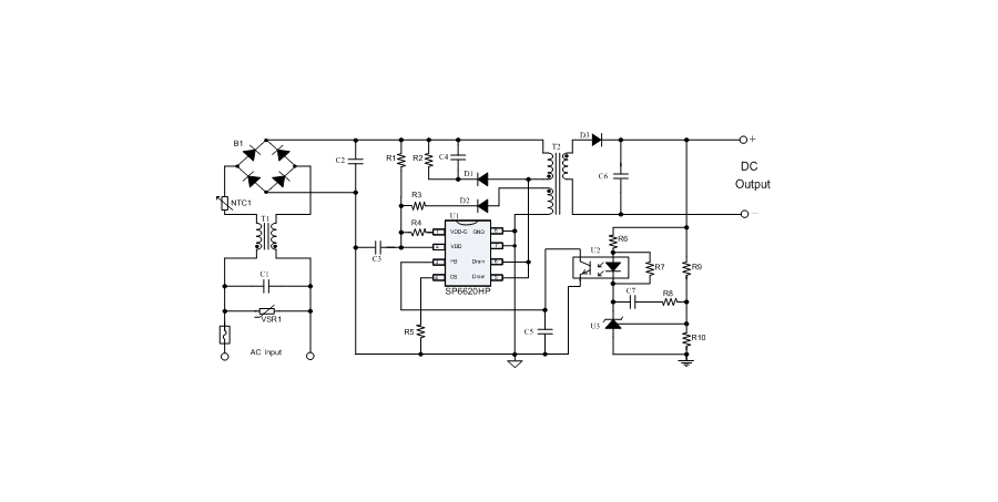 SP6620HP在PWM模式下工作于固定頻率,這個頻率是由內部精確設定的。在空載或者輕載時,工作頻率由IC內部調整。芯片可以工作在綠色模式,以此來減小輕載時的損耗,提高整機的工作效率,SP6620HP在啟動和工作時只需要很小的電流,可以在啟動電路中使用一個很大的電阻,以此來進一步減小待機時的功耗。芯片內置有斜坡補償電路,當電路工作于大占空比時,避免次諧波振蕩的發生,改善系統的穩定性。內置有前沿消隱時(Leading-edge blanking time),消除緩沖網絡中的二極管反向恢復電流對電路的影響。SP6620HP采用了抖頻技術,能夠有效改善系統的EMI性能。系統的跳頻頻率設置在音頻(20KHz)以上,在工作時可以避免系統產生噪音。SP6620HP內置多種保護,包括逐周期限流保護(OCP),過載保護(OLP),過壓保護(OVP),VDD過壓箝位,欠壓保護(UVLO),過溫保護(OTP)等,通過內部的圖騰柱驅動結構可以更好的改善系統的EMI特性和開關的軟啟動控制。SP6620HP使用DIP8無鉛封裝。