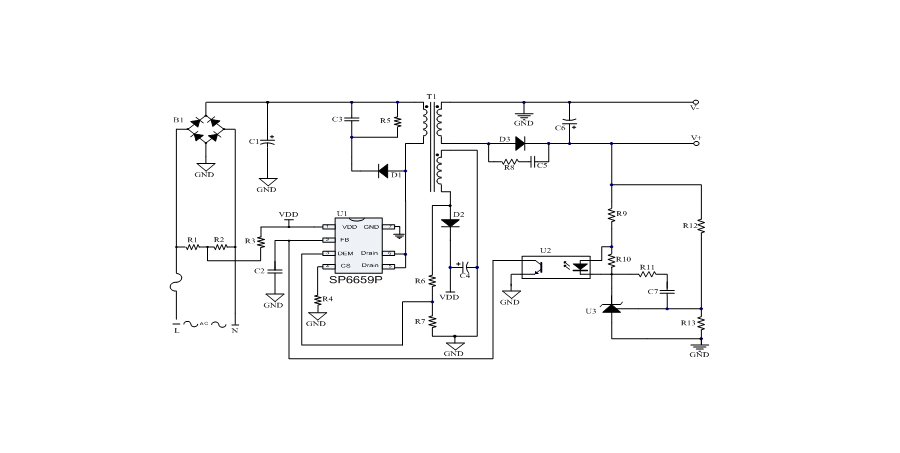 SP6659P是一顆高性能、多工作模式的PWM控制芯片。芯片可以工作在跳頻及綠色模式,以此來(lái)減小空載和輕載時(shí)的損耗,也可以工作在QR工作模式及CCM工作模式,提高整機(jī)的工作效率。SP6659P在啟動(dòng)和工作時(shí)只需要很小的電流,可以在啟動(dòng)電路中使用一個(gè)很大的電阻,以此來(lái)進(jìn)一步減小待機(jī)時(shí)的功耗。SP6659P內(nèi)置多種保護(hù),包括:輸入電壓過(guò)低保護(hù)(Brown-out),輸出電壓短路保護(hù),VDD過(guò)壓保護(hù)(OVP),VDD過(guò)壓箝位,VDD欠壓保護(hù)(UVLO),過(guò)溫保護(hù)(OTP)等。