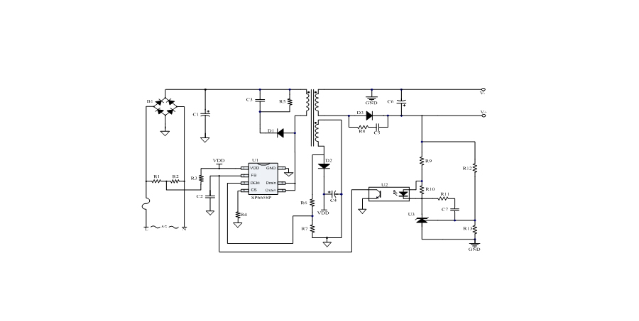 SP6658P是一顆高性能、多工作模式的PWM控制芯片。芯片可以工作在跳頻及綠色模式,以此來減小空載和輕載時的損耗,也可以工作在QR工作模式及CCM工作模式,提高整機的工作效率。SP6658P在啟動和工作時只需要很小的電流,可以在啟動電路中使用一個很大的電阻,以此來進一步減小待機時的功耗。SP6658P內置多種保護,包括:輸入電壓過低保護(Brown-out),輸出電壓短路保護,VDD過壓保護(OVP),VDD過壓箝位,VDD欠壓保護(UVLO),過溫保護(OTP)等。