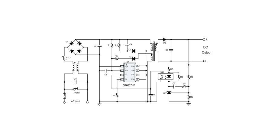SP6637HF是一顆電流模式PWM控制芯片,內置功率MOSFET,用于功率在15W以內的方案。該芯片在系統輸出空載時工作在跳頻模式,在系統輸出輕載到中等負載階段工作在PFM模式,在輸出重載時工作在最大恒定工作頻率。SP6637HF的啟動電流和工作電流設定的比較小,以此減小待機時的功耗。芯片內置有斜坡補償電路,避免次諧波振蕩的發生,改善系統的穩定性。芯片內置有前沿消隱時間(Leading-edge blanking time),消除緩沖網絡中的二極管反向恢復電流對電路的影響。該芯片帶有抖頻功能,能夠有效改善系統的EMI性能。芯片最低的工作頻率設置在音頻以上,在工作時可以避免系統產生噪音。SP6637HF內置多種保護,包括逐周期限流保護(OCP),過壓保護(OVP),VDD過壓箝位,欠壓保護(UVLO),過溫保護(OTP)等,通過內部的圖騰柱驅動結構可以更好的改善系統的EMI特性和開關的軟啟動控制。