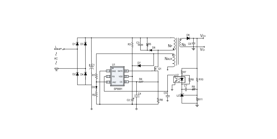 SP6681提供了完整的保護功能,包括逐周期過流保護(OCP),過載保護(OLP),外部過溫保護(OTP),輸出短路保護(SCP),輸出過壓和VDD過壓保護。IC內部頻率轉換技術實現了優(yōu)異的EMI效果,內部工作頻率控制技術使得23KHz頻率以下的能量最小化,來避免工作時產生噪聲。