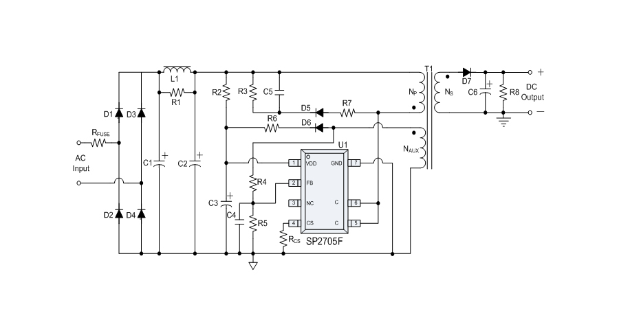 SP2705F非常適合低成本應(yīng)用方案,內(nèi)置環(huán)路補(bǔ)償,無需外置補(bǔ)償電容;采用原邊反饋控制,無需光耦和TL431。